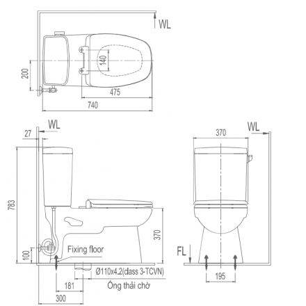 - Kiểu xả Siphon dạng nhấn 2 mức: 5L/3L
