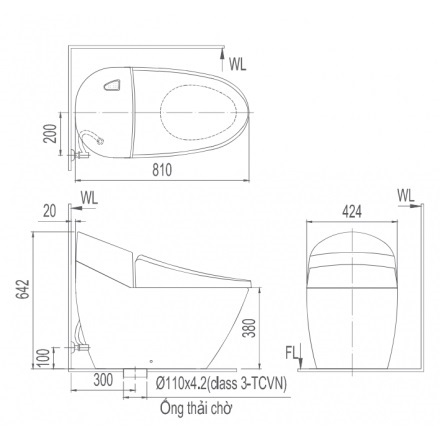 - Kích thước bồn cầu: 810 x 424 x 642 mm (dài x rộng x cao)